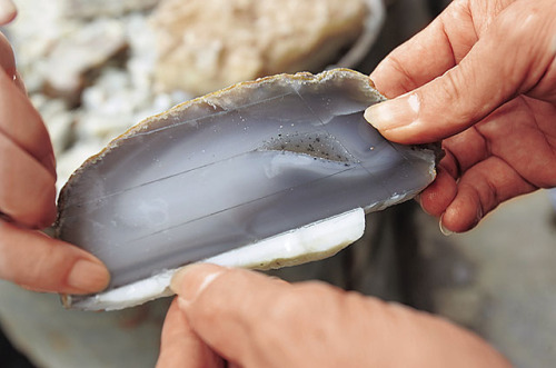 造假天珠以从巴西、乌拉圭进口或来自辽宁的灰白玛瑙为原料,先用刀片划出可切割的部分作为制作假天珠的材料。